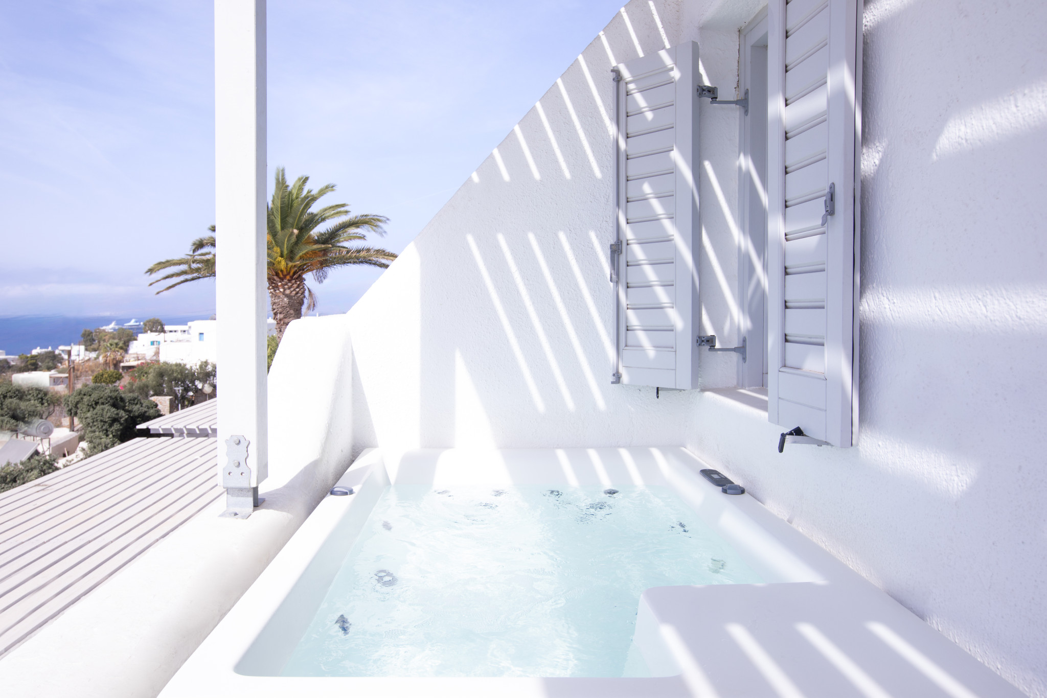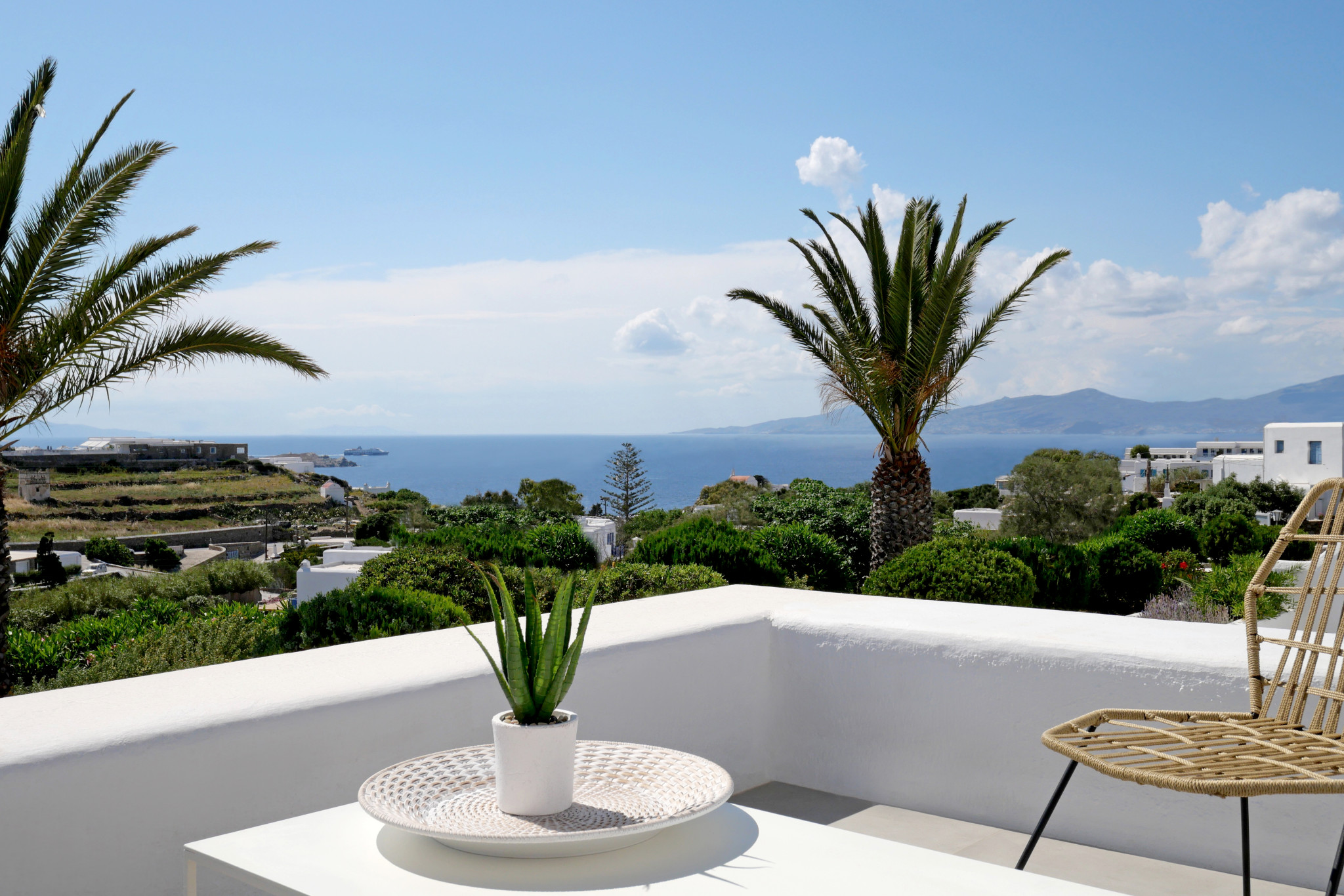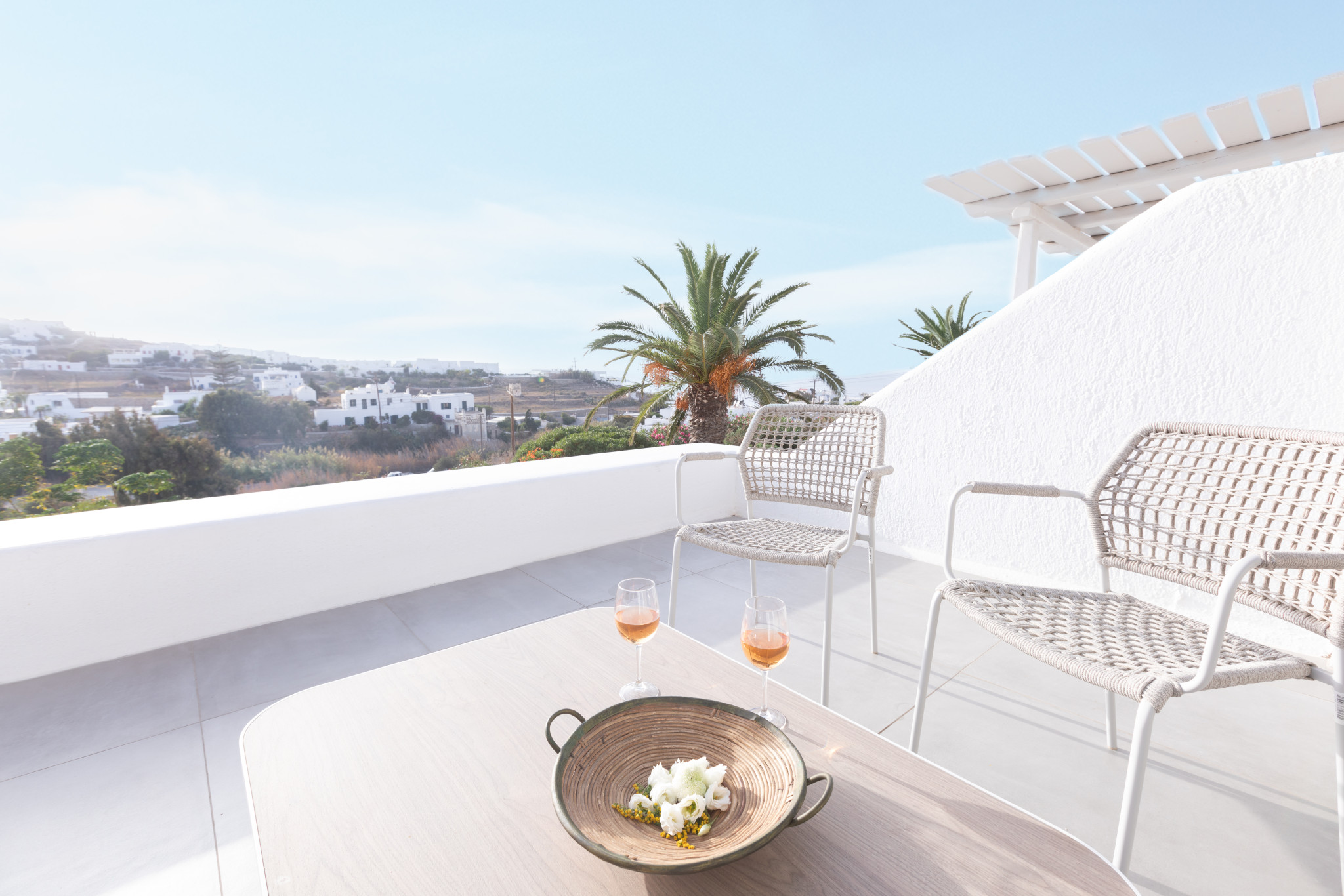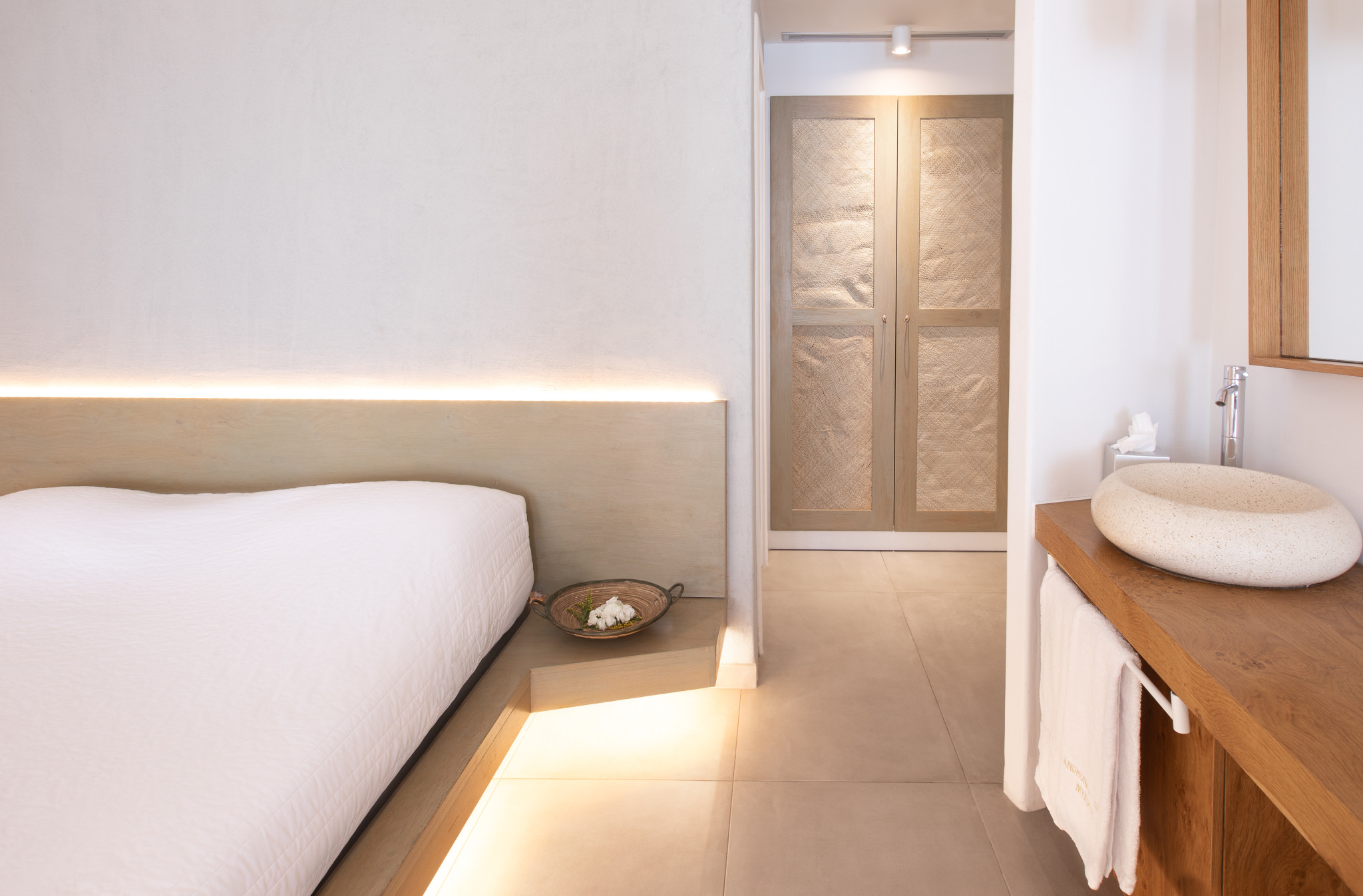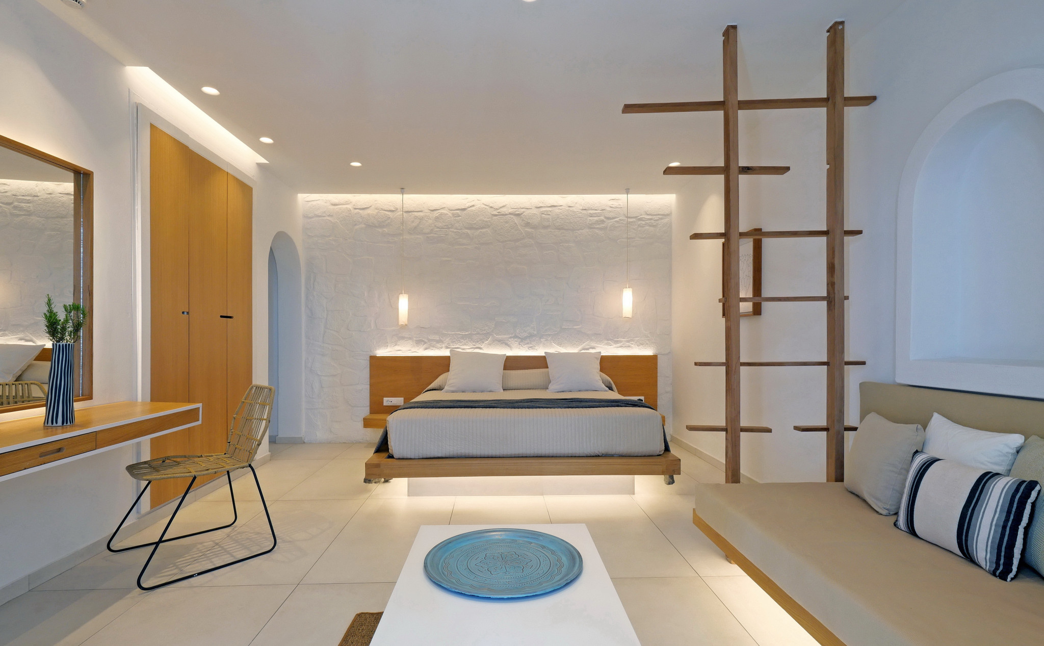 Earthy colors with natural materials used throughout the space, make the Junior Suite an ideal space that will connect you perfectly to the dry and vibrant environment of Mykonos island.  The Junior suite offers a spacious room with king size bed, living area with one or two lounge sofa-beds with soft anatomical mattress, bathroom with shower and a balcony with outdoor jacuzzi
